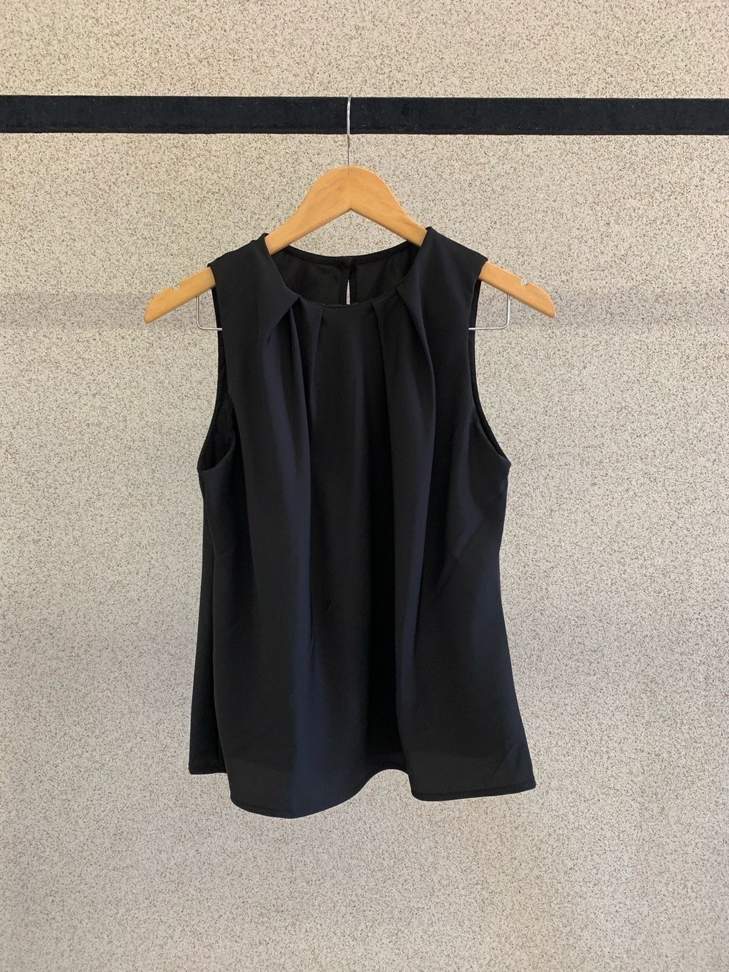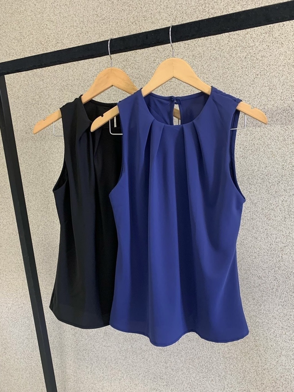 A blusa Tânia é uma peça de vestuário feminina sem mangas, com design elegante e discreto. Possui decote arredondado e pregas frontais suaves, que criam um caimento fluido e sofisticado, ideal para compor looks formais ou casuais com um toque refinado. O tecido tem um acabamento levemente acetinado, conferindo um visual polido e moderno.