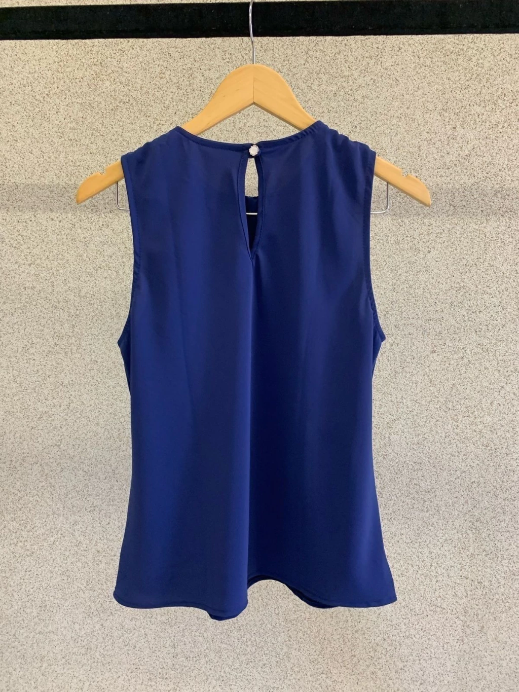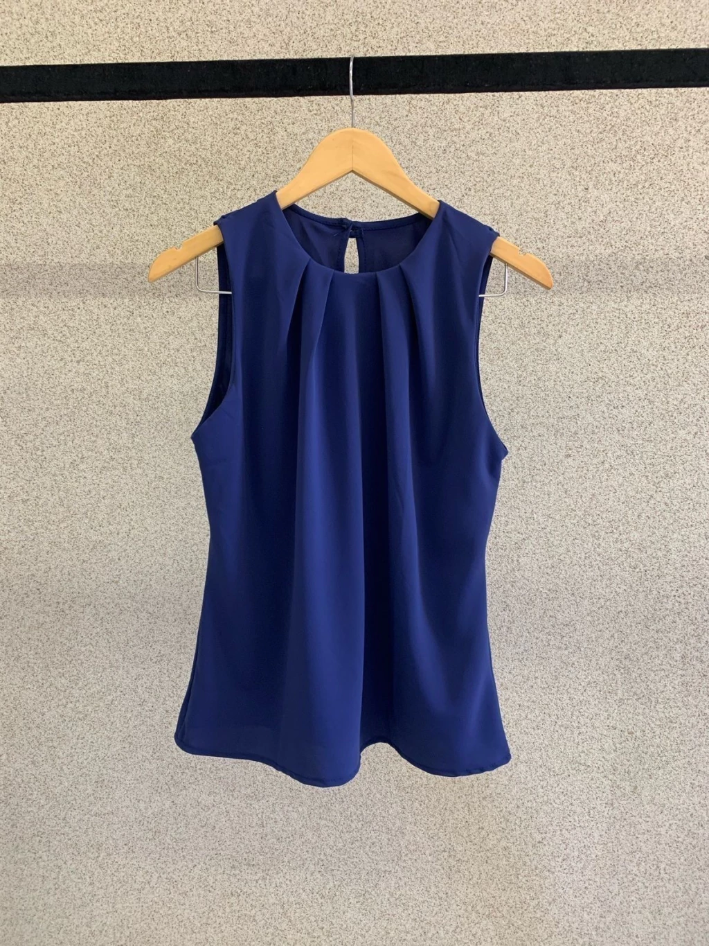 A blusa Tânia é uma peça de vestuário feminina sem mangas, com design elegante e discreto. Possui decote arredondado e pregas frontais suaves, que criam um caimento fluido e sofisticado, ideal para compor looks formais ou casuais com um toque refinado. O tecido tem um acabamento levemente acetinado, conferindo um visual polido e moderno.