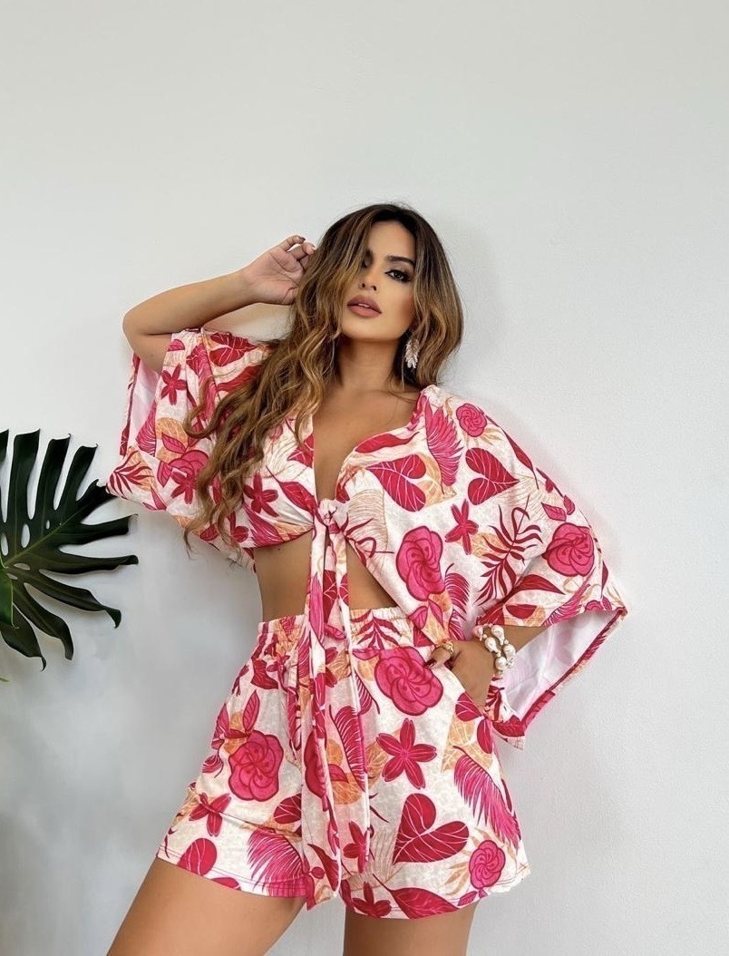 O Conjunto Brisa é confeccionado em tecido fluit poliamida, conhecido por sua leveza, toque macio e caimento fluido. A parte superior apresenta um modelo de blusa com mangas amplas e soltas estilo kimono, que garante conforto e sofisticação. O fechamento frontal é feito por amarração, permitindo ajuste personalizado ao corpo e um toque moderno ao visual.