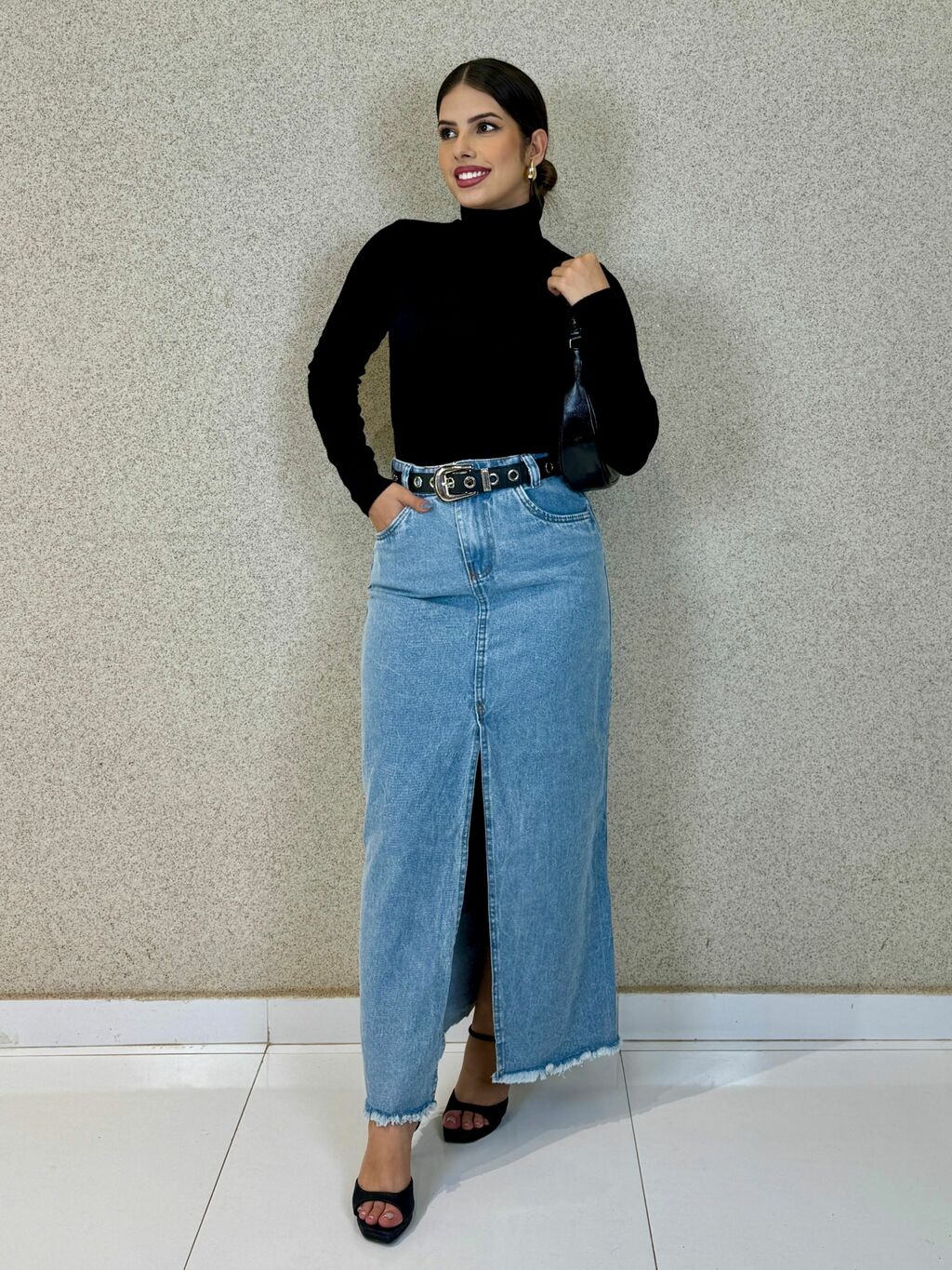 Saia jeans, com comprimento midi, bolsos frontais e traseiros, fenda única no meio da peça, ao final do comprimento.