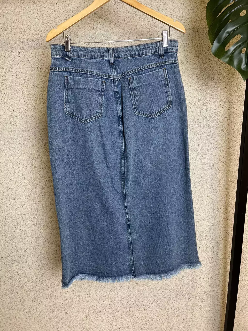 Saia jeans, com comprimento midi, bolsos frontais e traseiros, fenda única no meio da peça, ao final do comprimento.